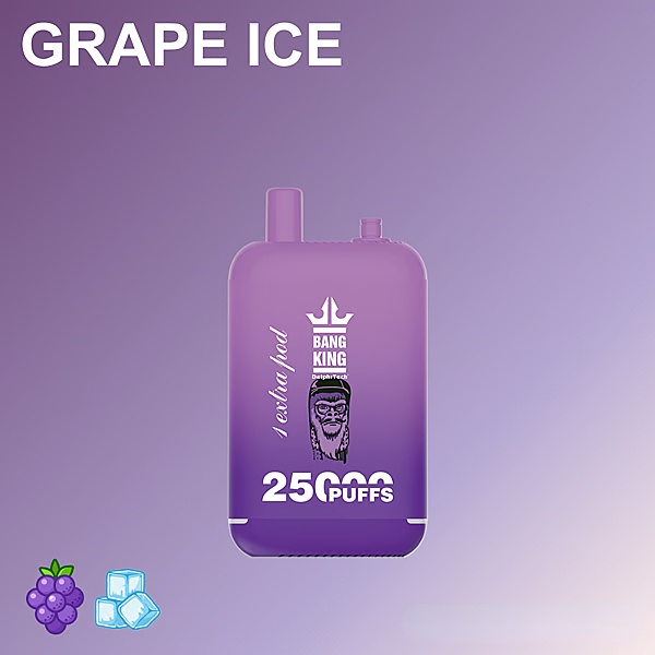El cigarrillo electrónico desechable Bang King 25000 Grape Ice impresiona con su sabor a uva helada y sus 25.000 caladas de resistencia. El sistema de doble vaina de 46 ml, la bobina de malla de 1,0 Ω y la batería de 650 mAh garantizan una experiencia de vapeo suave y sabrosa, disponible en nicotina 0 %, 2 %, 3 % y 5 %.