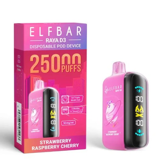 ELF BAR RAYA D3 25000 Strawberry Raspberry Cherry è una sigaretta elettronica monouso di prima classe con aromi di fragole, lamponi freschi e ciliegie dolci. Con 25.000 boccate, tre modalità di alimentazione e ricarica rapida USB-C, offre un'intensa esperienza ai frutti di bosco ai massimi livelli.