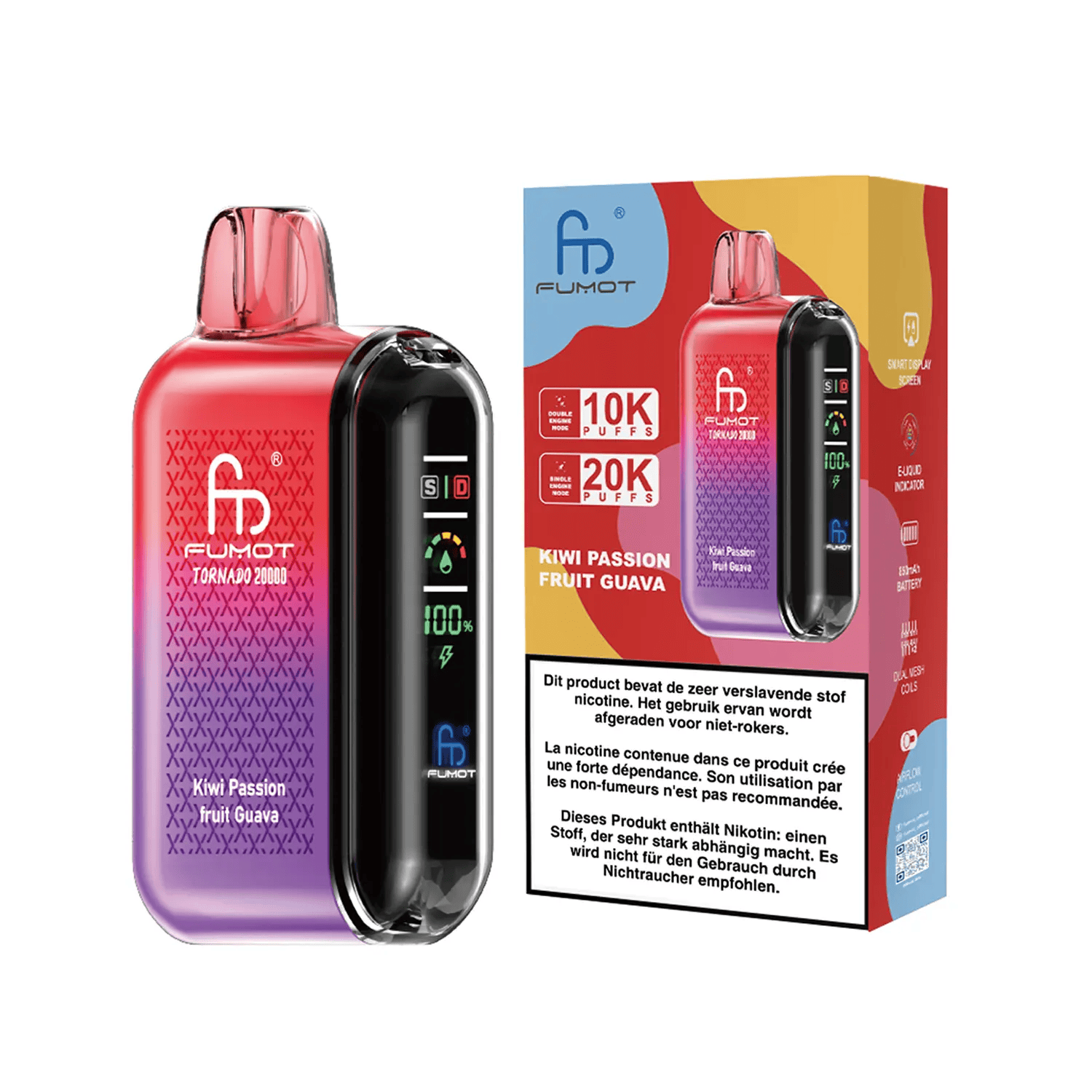 Der Fumot Tornado 20000 Kiwi Passion Fruit Guava ist eine hochwertige Einweg E-Zigarette mit exotischem Kiwi-Passionsfrucht-Guave-Aroma, 20 ml E-Liquid und bis zu 20.000 Zügen. Mit Dual Mesh Coil, OLED-Display und wiederaufladbarem 850-mAh-Akku – verfügbar in 0 %, 2 %, 3 % und 5 % Nikotin.