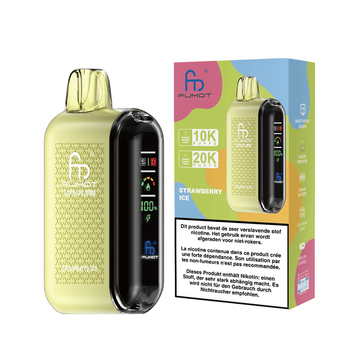 Der Fumot Tornado 20000 Strawberry Ice ist eine hochwertige Einweg E-Zigarette mit fruchtig-kühlem Erdbeer-Menthol-Aroma, 20 ml E-Liquid und bis zu 20.000 Zügen. Mit Dual Mesh Coil, OLED-Display und wiederaufladbarem 850-mAh-Akku – verfügbar in 0 %, 2 %, 3 % und 5 % Nikotin.